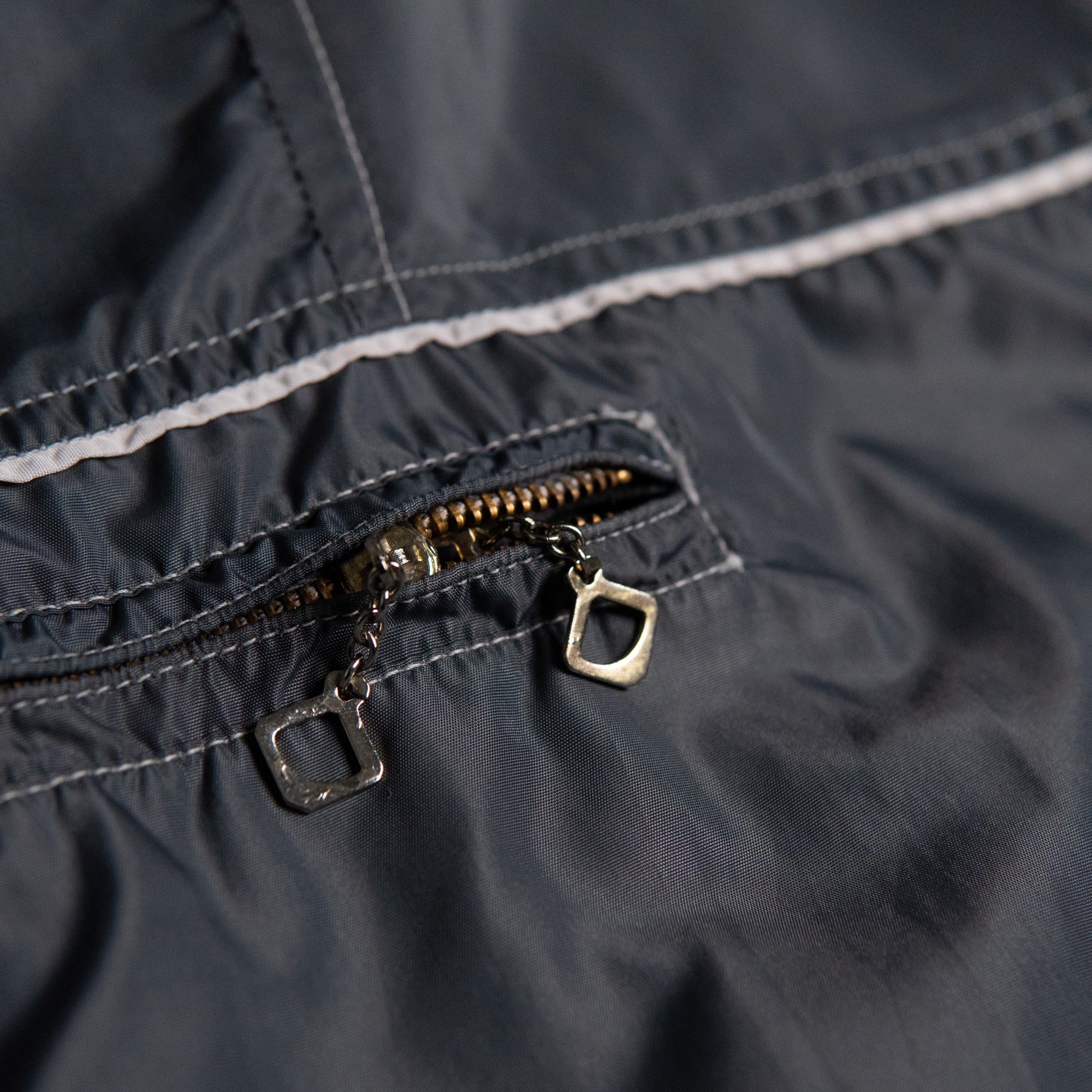 ナイロン系素材の深いチャコールグレーのボディに、1本の白いパイピングが走っているのが目を引きます。