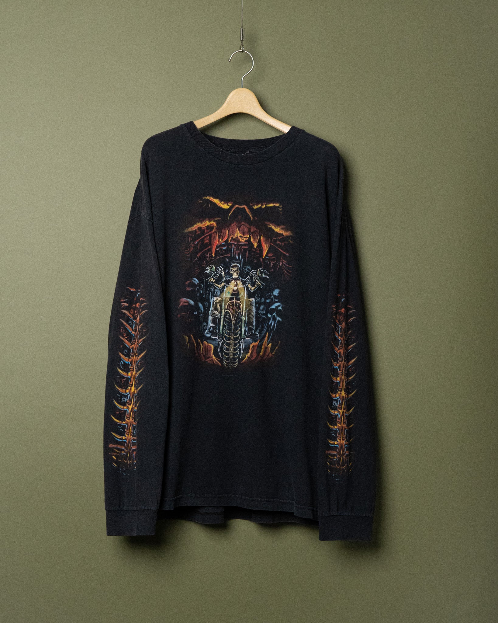 フロントに大判で描かれた、バイクに跨るスケルトンライダーのグラフィックが強烈なロングスリーブTシャツ。