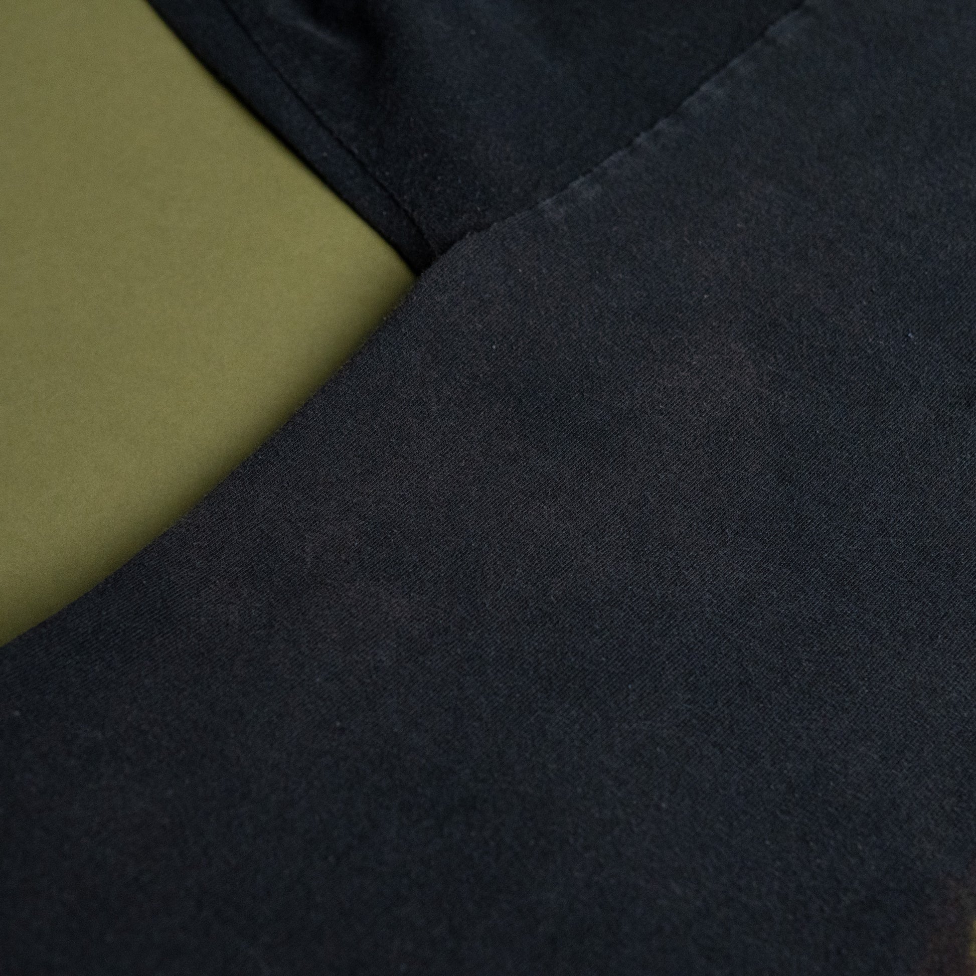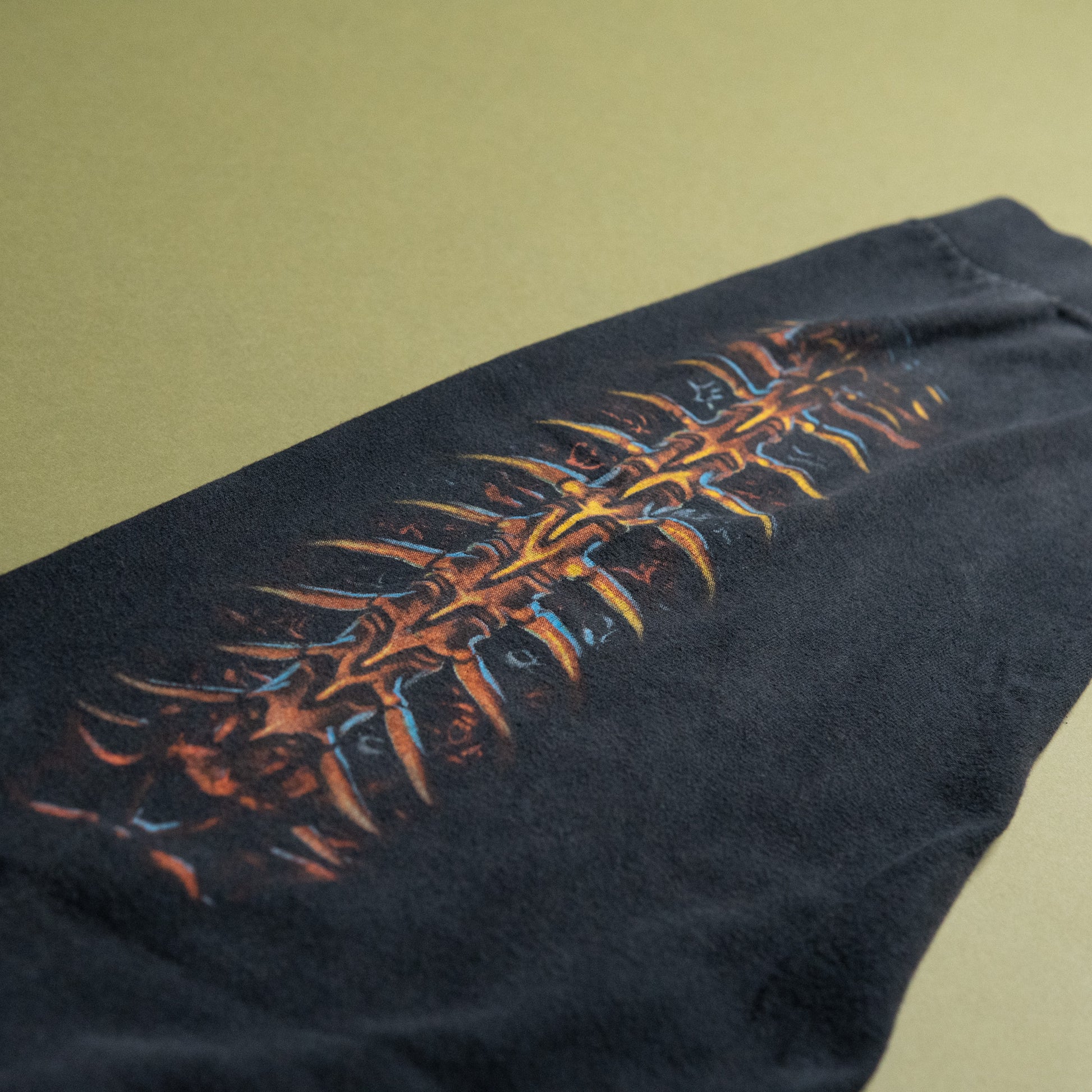 袖にも脊椎をモチーフにしたようなボーングラフィックが大胆にプリントされており、フロント・バック・スリーブを通して抜かりなく主張の強い構成。