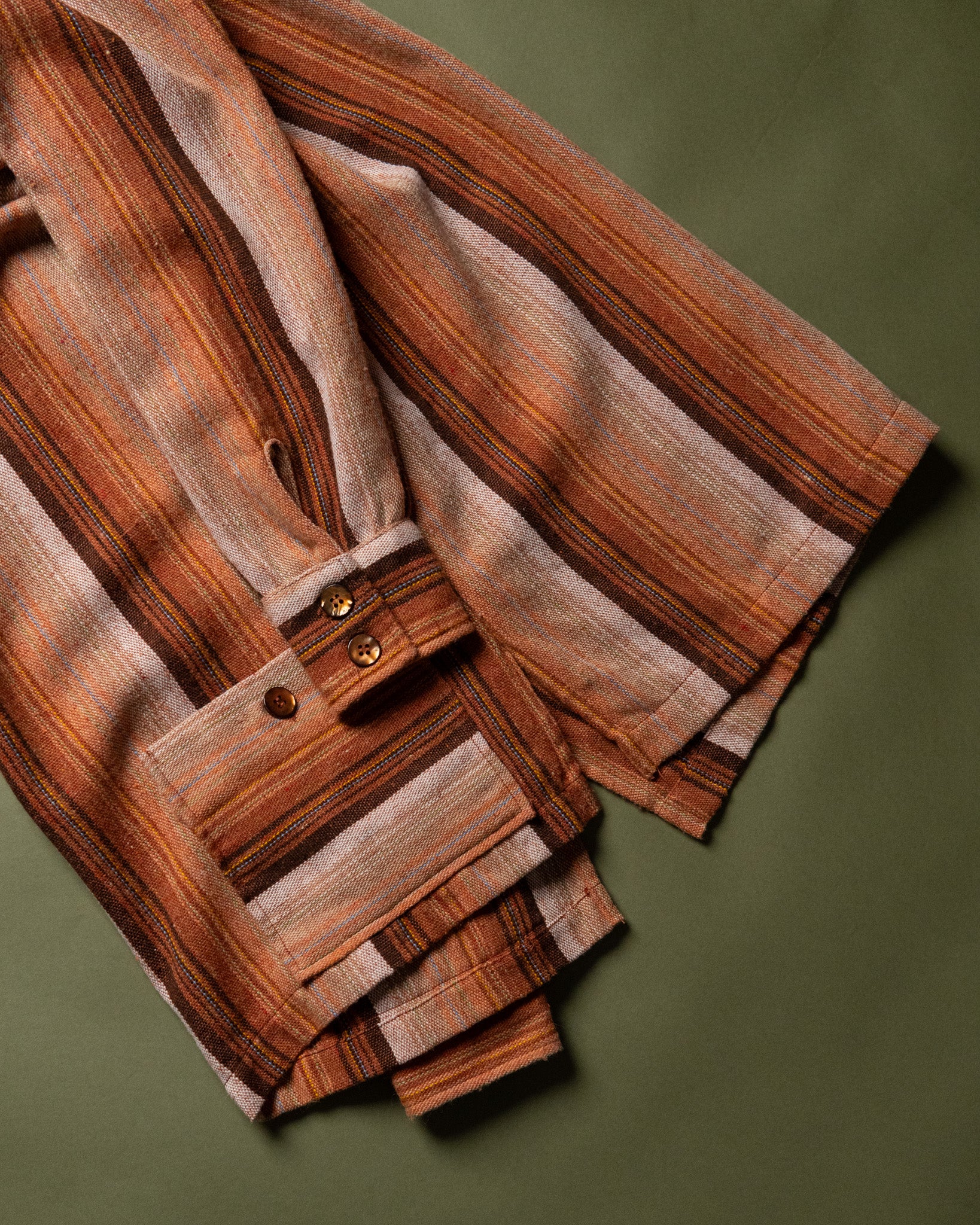 やや厚めのストライプ生地を用いた、プルオーバーのシャツジャケット。