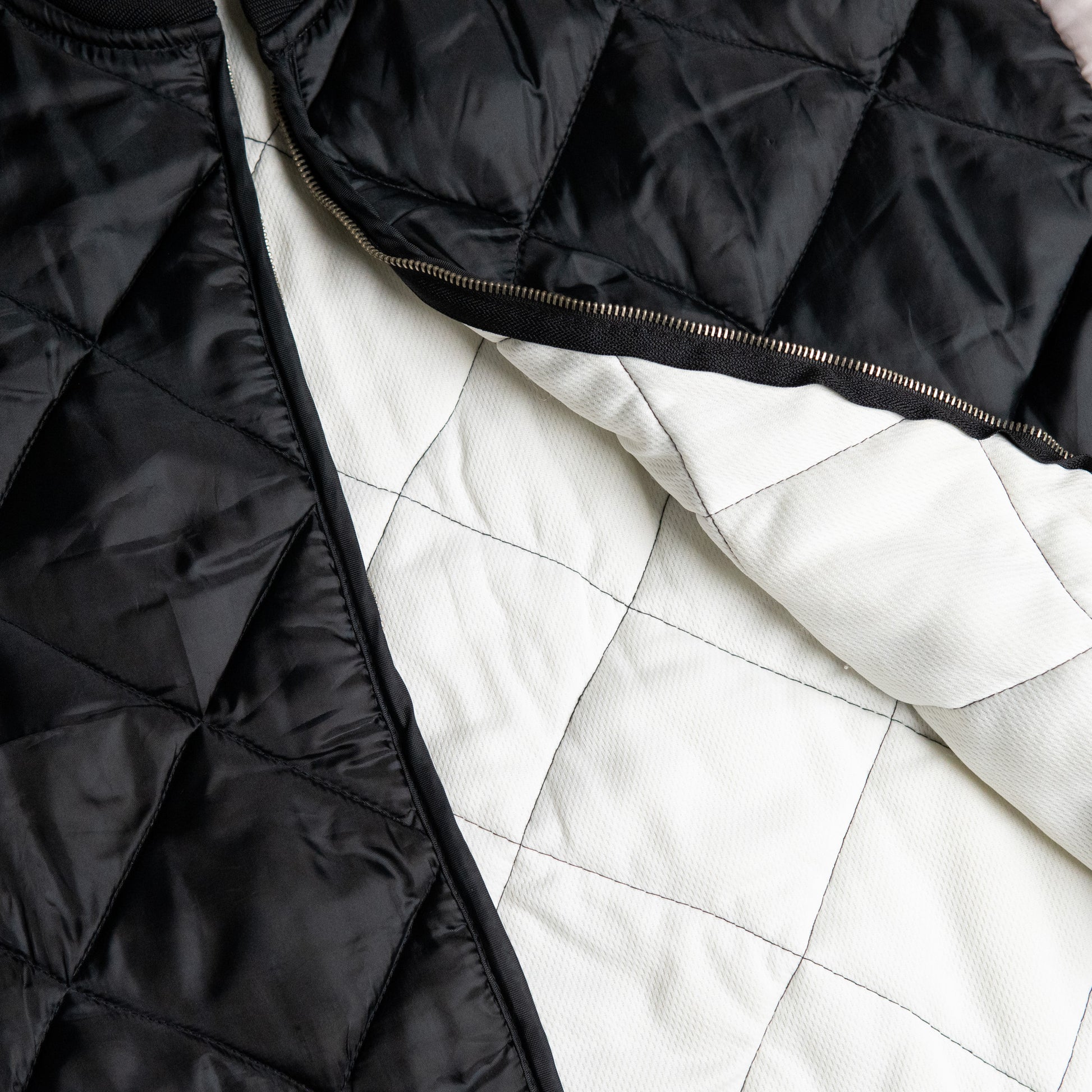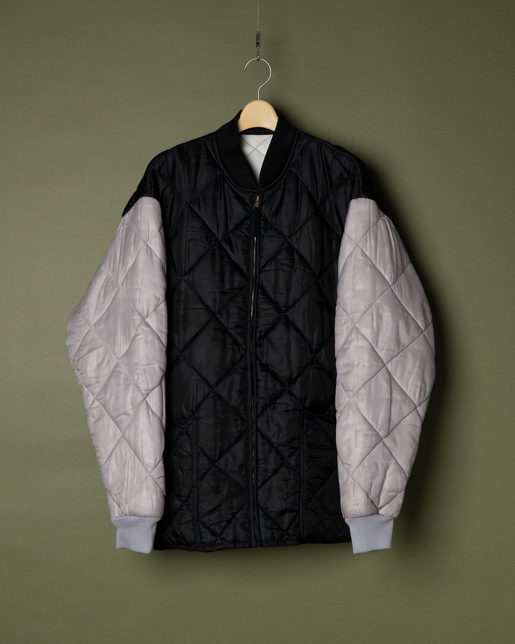 ブラックとライトグレーのバイカラーで構成された、キルティングジャケット。