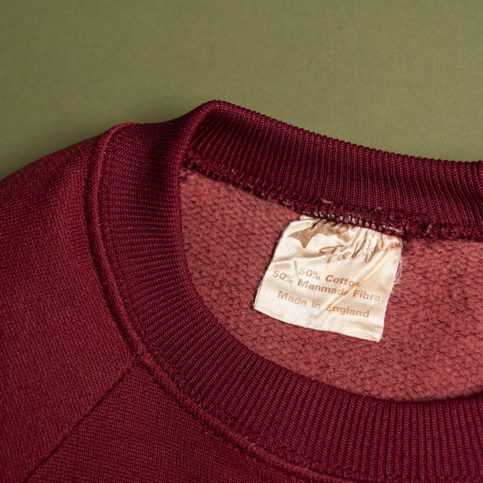 古いスウェットによくある、化繊でテカった、あの軽い生地です。この生地でワインレッドとなると、余計に枯れた感じがでますね。
