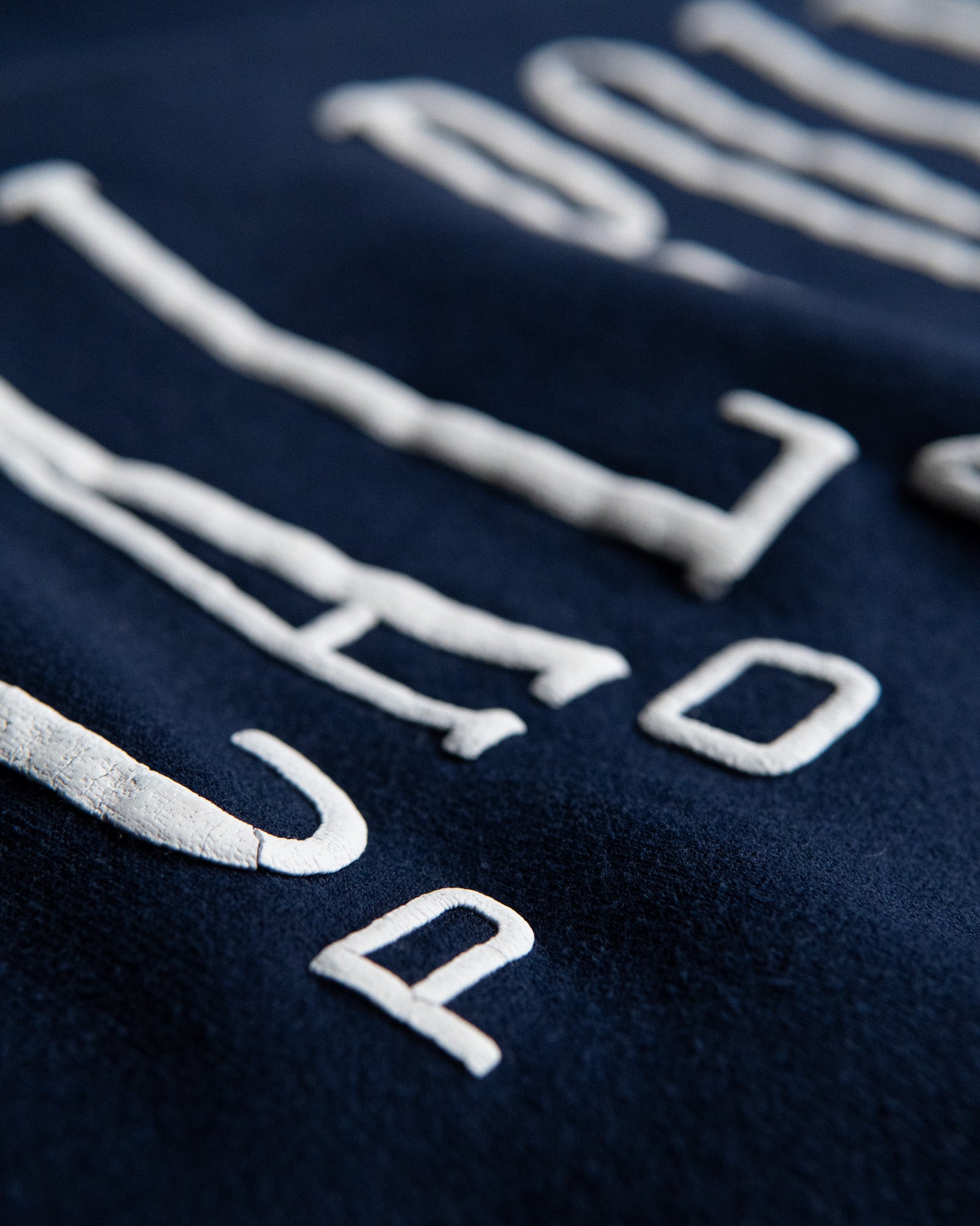 いわゆるカレッジスウェットですが、裾近くに大きく配置されているのが新鮮で、モダンな印象。