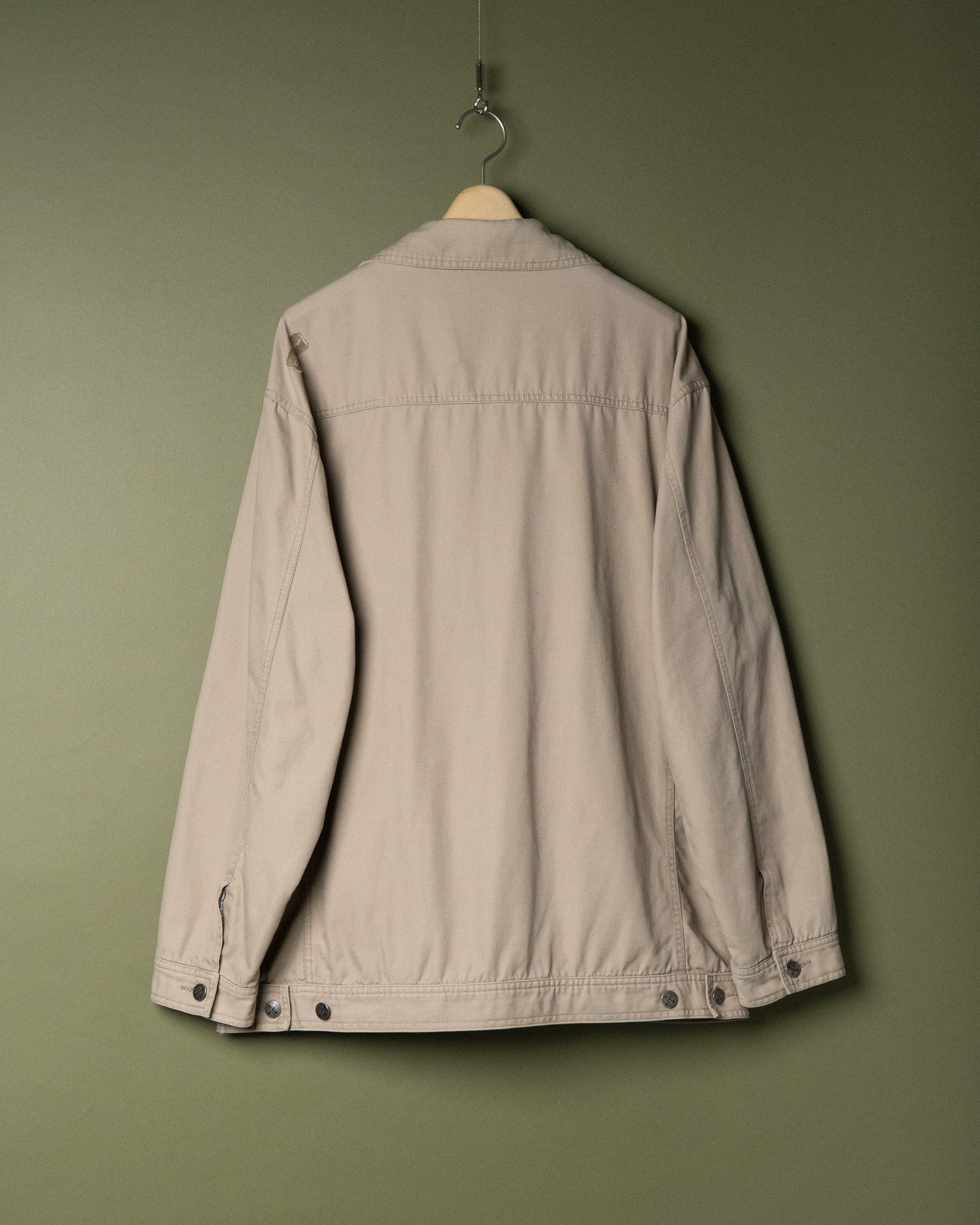 いわゆるトラッカージャケットに見られる、裾に向けて細くなる形ではなく、カバーオールのように安心感のある身幅をしています。