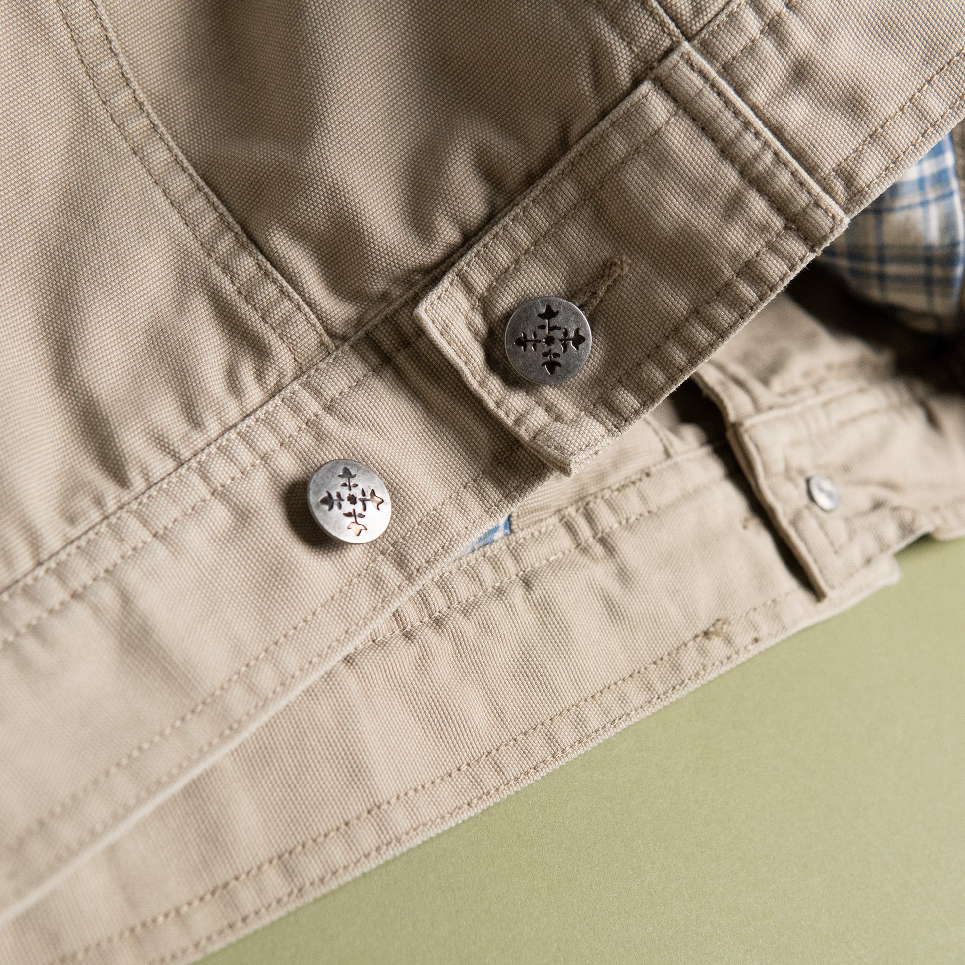 フロントの構造も特徴的で、ボタンの下にジップが隠れる二層構造になっています。